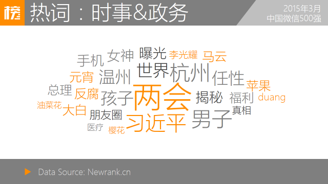 通过对“时事”、“政务”两类共计7854篇热文进行分词聚类后,统计发现:“两会”、“反腐”、“马云”、“李光耀”等词汇在本月中被讨论得最多,其中“大白”与“duang”为三月新增词汇。