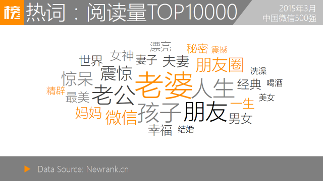 将本月阅读数最高的一万篇内容标题查重后发现,以完全匹配标题出现一次以上的内容(即标题重复次数≥2)共有2756篇,进行词频统计后发现,“老婆”、“老公”、“孩子”、“朋友”与“人生”为权重最高的五个词汇。所有高频词汇均无时效特征,围绕人情主题,用语直白。