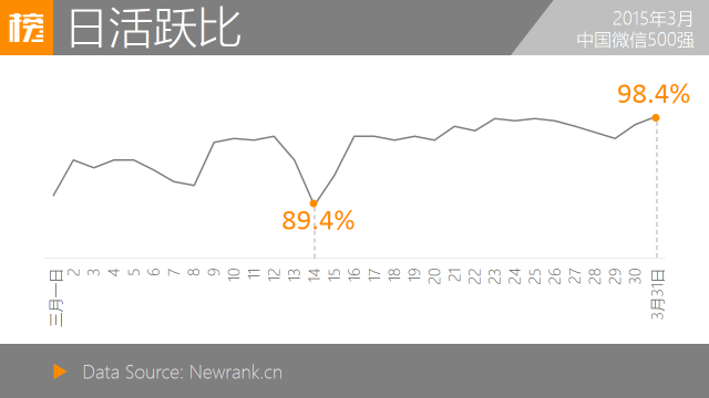3月间,500强账号日活跃比维持在89.4%与98.4%之间。3月14日共有447个账号群发图文消息,达日活跃比最低值。因其仍逼近90%,且未检测到系统性影响因素,疑为正常波动。