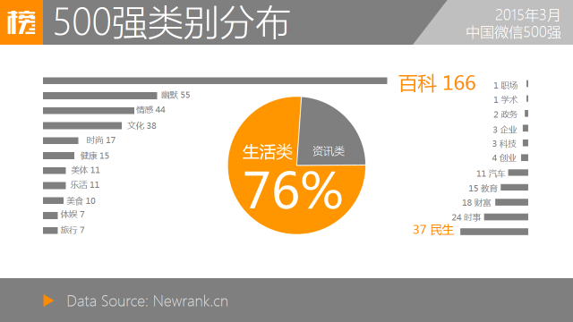 500强中所占席位最多的类别顺次为:百科(166)、幽默(55)、情感(44)、文化(38)与民生(37)。较往月相比,百科类账号数量激增,幽默、情感及文化类账号相对减少。