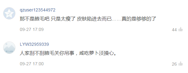 小编发现,同时也有人指出:“那不是腋毛吧,只是太瘦了,皮肤陷进去而已”。