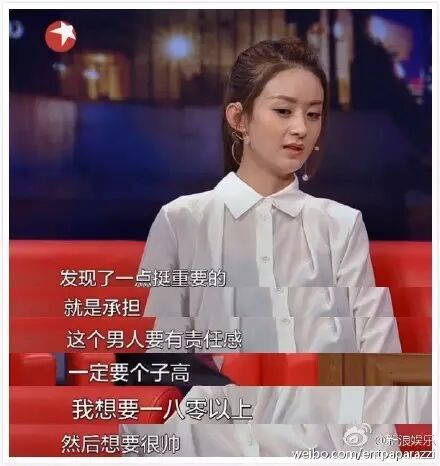 赵丽颖还公布了择偶标准,没想到赵丽颖也是个外貌党,哈哈,个子要180以上而且要非常帅,最重要要有责任感!