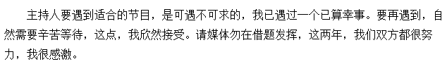 “做主持人应对过那么多大场面,但做回自己的时候,问个路我都害怕。我发现这就是我在职业中养成的性格,我的目的就是把这条路走完,根本没想到我要慢下来。”
