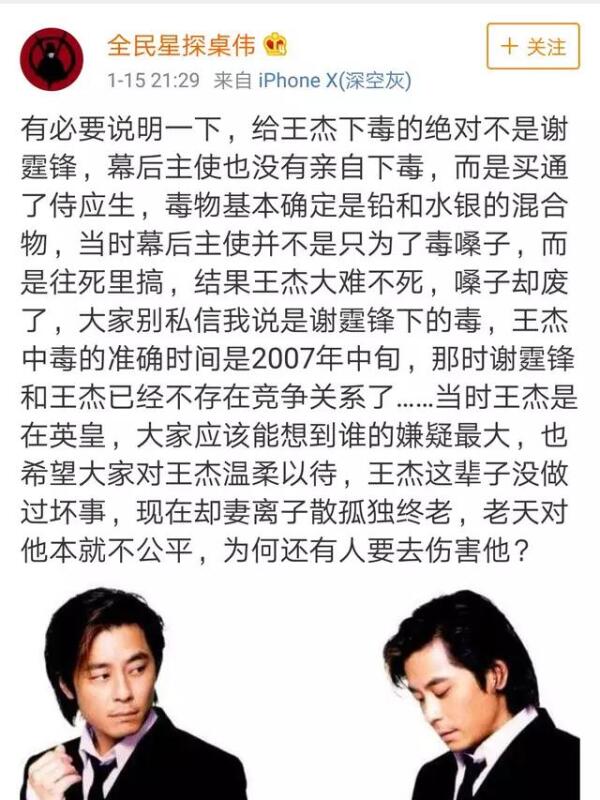 就在昨天,娱乐圈“第一狗仔”卓伟又曝了娱乐圈的另一个猛料,就是当年王杰被人下了毒,导致嗓子沙哑事件。他在声明中表示,当年给王杰下毒的并不是谢霆锋,而是另有其人。他还透露了重要的一点,就是当时王杰在英皇,大家猜到是谁了吗?