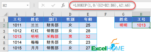 如下图所示,要根据H2单元格姓名,查询所在的部门。