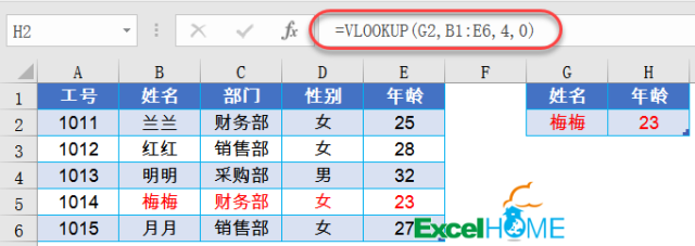 如下图所示,要根据G2单元格姓名,在A~E数据区域中查询对应的年龄。