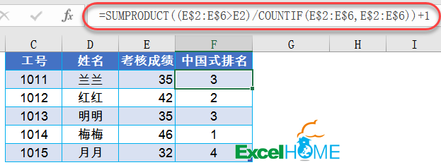 如下图所示,要对E列的成绩进行中国式排名,也就是相同成绩不占用名次。
