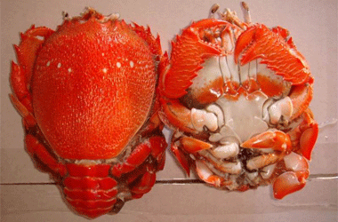 红花蟹产于我国南方,主要分布与我国海南沿海。外观,壳呈浅红或瘀红,额角长六棘。肉质鲜甜,肉量饱满,常用作冻蟹,味道极佳。此蟹种1.5斤以上大蟹价格略高于小蟹,肉质也更好。