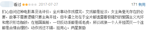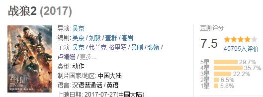 和《建军大业》屏蔽评分与评论的“高冷”做法不同,《战狼2》的评分一目了然,相较第一部的6.8,可以说进步了不少。