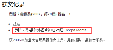 2005年在多伦多国际电影节上,《水》惊艳亮相,而直到2007年,影片才得以在印度国内上映。它还曾获得第79届奥斯卡最佳外语片提名。