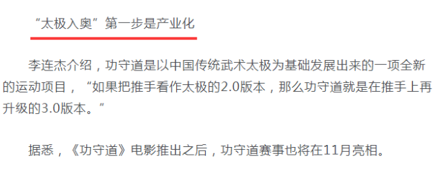 在这样的背景下,马云和李连杰试图让传统武术成为全民运动,乃至世界级运动,在标准的基础上发展成为体育项目,进而全球推广,实现全民参与。