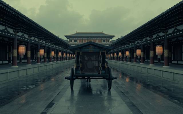 一段是空海和尚坐马车行在雨后的皇城里,青石板路泛着古意的光泽,配上唐城灰白色的墙帏与赭红色的殿柱,又一瞬间将身心沉静下来,顺利进入了故事。