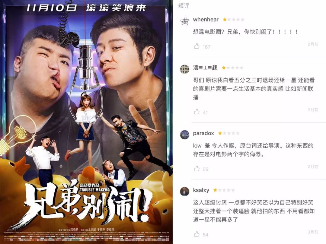 有人欢笑,有人愁:“四天天王”黎明执导的《抢红》仅收获1690万元的票房,而相声演员高晓攀执导的《兄弟,别闹!》则只卖出了1209万元。对这两部电影,豆瓣评分更是分别给出了3.1和3.3的大低分。