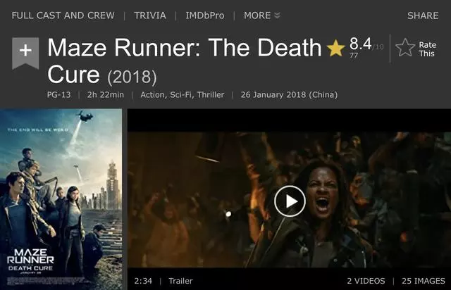 《移动迷宫3:死亡解药》在北美的口碑也已正式解禁,IMDB上的粉丝评分达到了8.4分,媒体的评价也相当不错。