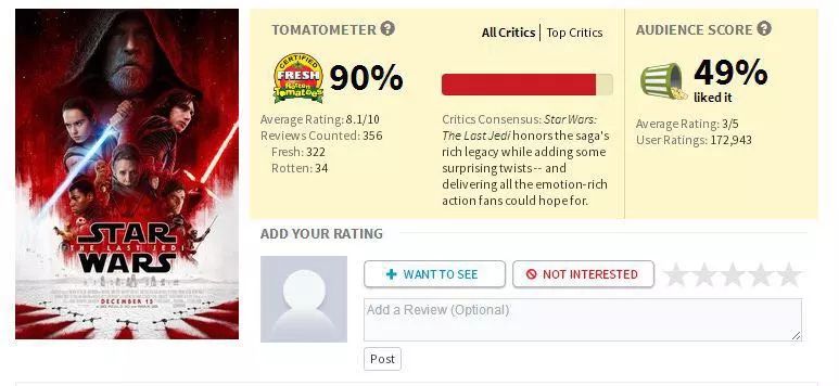 ▲《星战8》的烂番茄评分