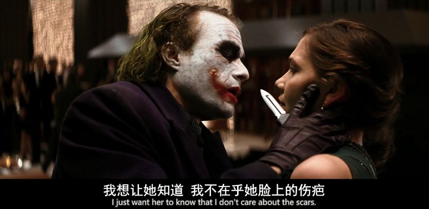 病态残忍的终极乐趣,毁灭背后的愉悦,破坏背后的大笑,以及一切背后的疯狂,让他的表演极富吸引力、威慑力和视觉冲击力。他是一流的超级反派,舔舐着嘴角的伤疤,在莱杰的表演下脱胎为如马龙·白龙度饰演般心理变态的怪咖。他将邪恶演绎成了一种富有魅力的艺术,是超越时间的存在。
