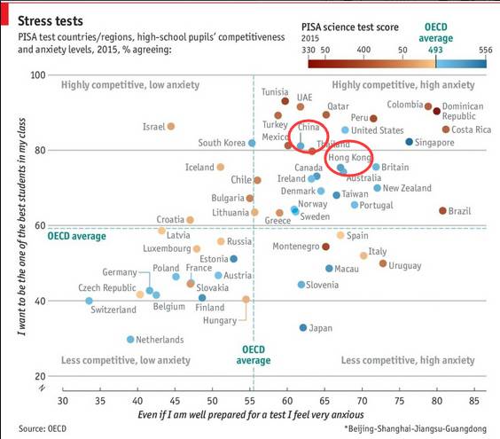 OECD(经合组织)每隔三年都会面向全球各个国家的中学生做一项国际学生评估,数据显示,香港中学生渴望成为优等生的总体预期虽低于大陆,但承受的压力并不输给内地