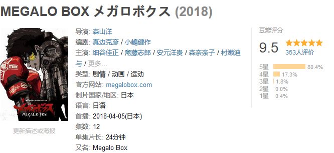 作为一部4月5日播出的新作,Megalo Box开播第一集就拿下9.5的高分,可以说风头直逼早些时候的紫罗兰了。