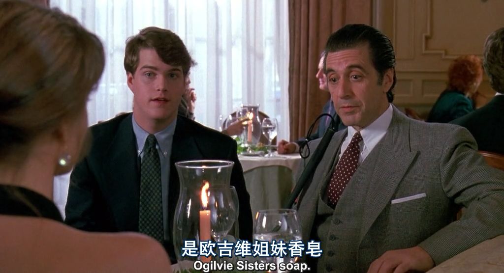 第四个,则是全片最经典的一幕,弗兰克在餐厅闻到唐娜身上清新的肥皂香味,并且判断出是欧吉维姐妹香皂。