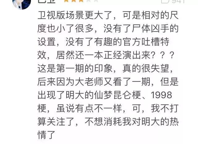 网友的吐槽正好说明了这一状况:“卫视版场景更大了,可是相对的尺度也小了很多,没有了尸体凶手的设置,没有了有趣的官方吐槽特效,居然还一本正经演出来???感觉真的有点尬。”