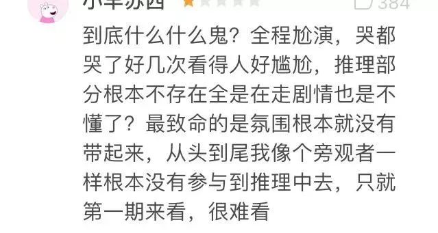 其中不少新嘉宾被认为还不理解这个综艺的风格,没能投入地参与推理游戏,而一味只在“尬演”,以至《明侦》“被生生改成了《演员的诞生》”,有网友评价称,该综艺“推理部分根本不存在,全是在走剧情,最致命的是氛围没带动起来”,“观众从头到尾像个旁观者一样没能参与到推理中”。