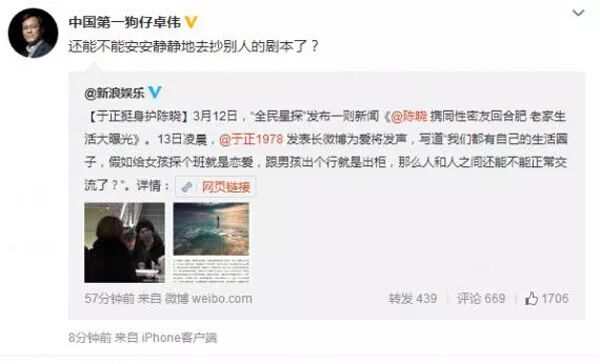因文中出现陈晓妈妈相关生活细节,陈晓怒斥狗仔打扰家人生活。于正随后跟进长文维护陈晓,称“我们都有自己的生活圈子,假如给女孩探个班就是恋爱,跟男孩出个行就是出柜,那么人和人之间还能不能正常交流了?”