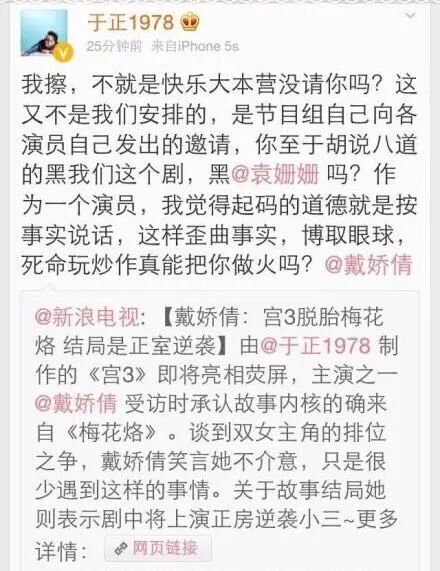 2014年,演员戴娇倩接受采访时暗指,自己在《宫锁连城》中被袁姗姗抢戏,于正随后马上发微博炮轰戴娇倩,说其“胡说八道黑剧组,黑袁姗姗”。