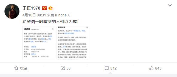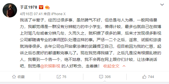 随后,于正又发了一条微博,称面对制造网络暴力的“一群没有分辨能力的中小学生”,以往自己不进行理会,现在却“积攒了很多黑”,所以决定拿起法律武器捍卫自己。