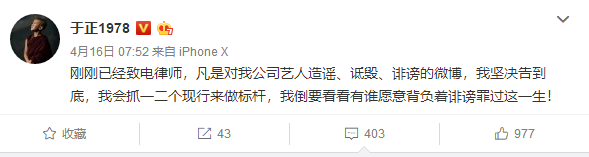 接着,他又连发了两条微博,称已致电律师,要抓一两个现行来做标杆,“凡是对我公司艺人造谣、诋毁、诽谤的微博,我坚决告到底”。并发了两张关于“诽谤罪”定义及量刑标准的截图:“希望图一时嘴爽的人引以为戒!”