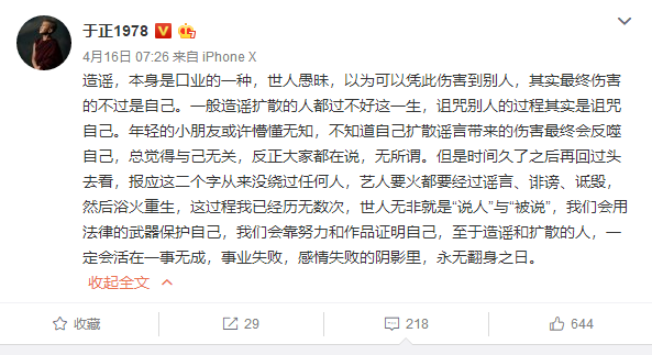 在其发的第一条微博中,于正称“艺人要火都要经过谣言、诽谤、诋毁,然后浴火重生”,并放狠话:“造谣和扩散的人,一定会活在一事无成,事业失败,感情失败的阴影里,永无翻身之日。”