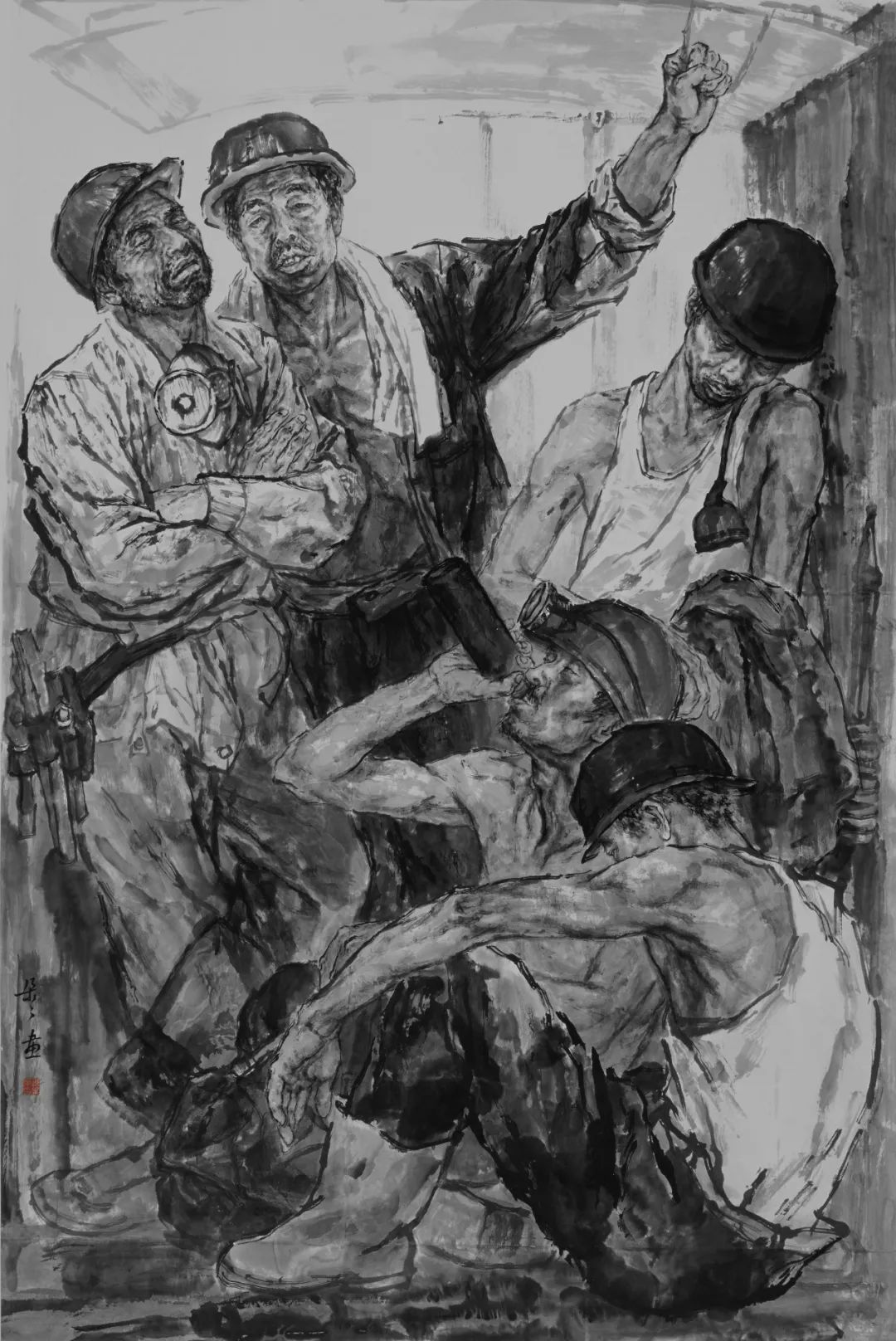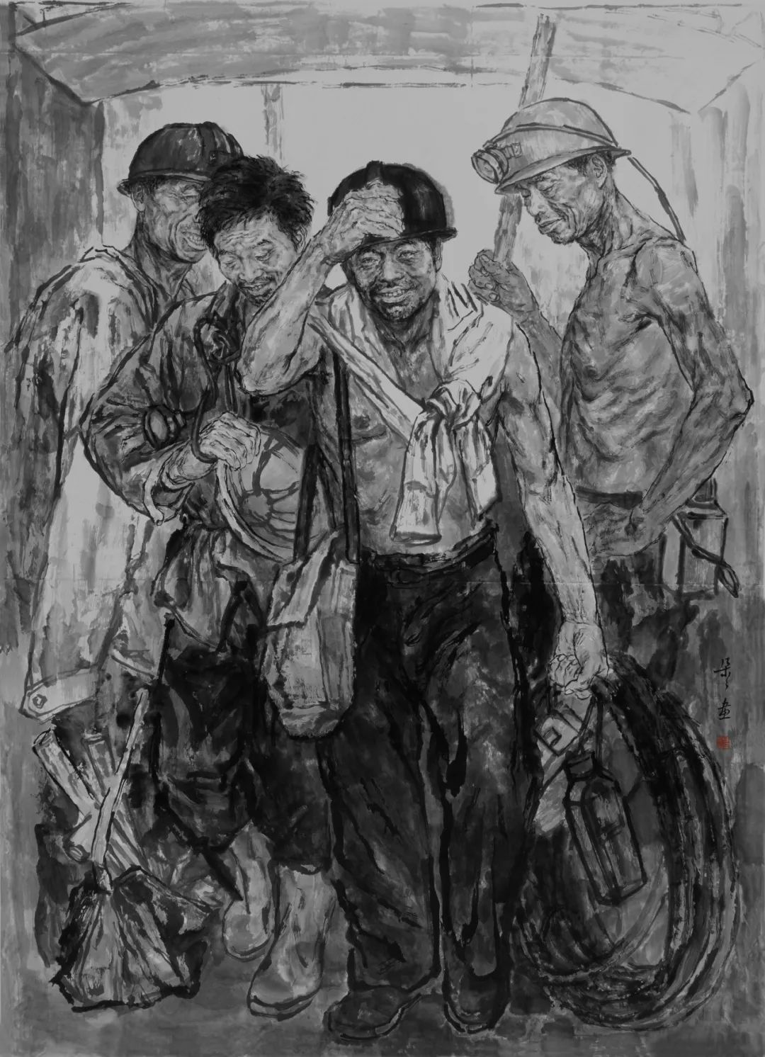有才气又肯用功,朵朵在专业上便有了大的进步,除了严谨扎实的造型基础之外,她对于专业技法的把握也十分娴熟,本科创作她画了张工笔,设色大胆亮丽,渲染出礼仪小姐的婀娜多姿;研究生的毕业创作,她一改清新地抒情风格,选择了煤炭工的题材,并使用写意的水墨技法来表现。近些年美院的本科及研究生的创作,用工笔技法的多,因为比较保险,容易出效果。而用水墨写意来画创作,是多少具有挑战意味的,所喜朵朵的挑战是成功的,狠而泼辣的笔墨技法,表现出一群质朴而厚重的矿工汉子,苍桑的画面效果与作者戴着眼镜的文弱形象,形成了巨大的反差,让人似乎有些疑惑,朵朵那双白皙瘦弱的双手,怎么能画出如此沉重的画面?好几年过去了,我似乎还清晰地看到了她的那一群矿工有说有笑地向我们走来。