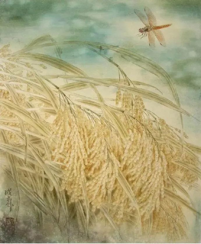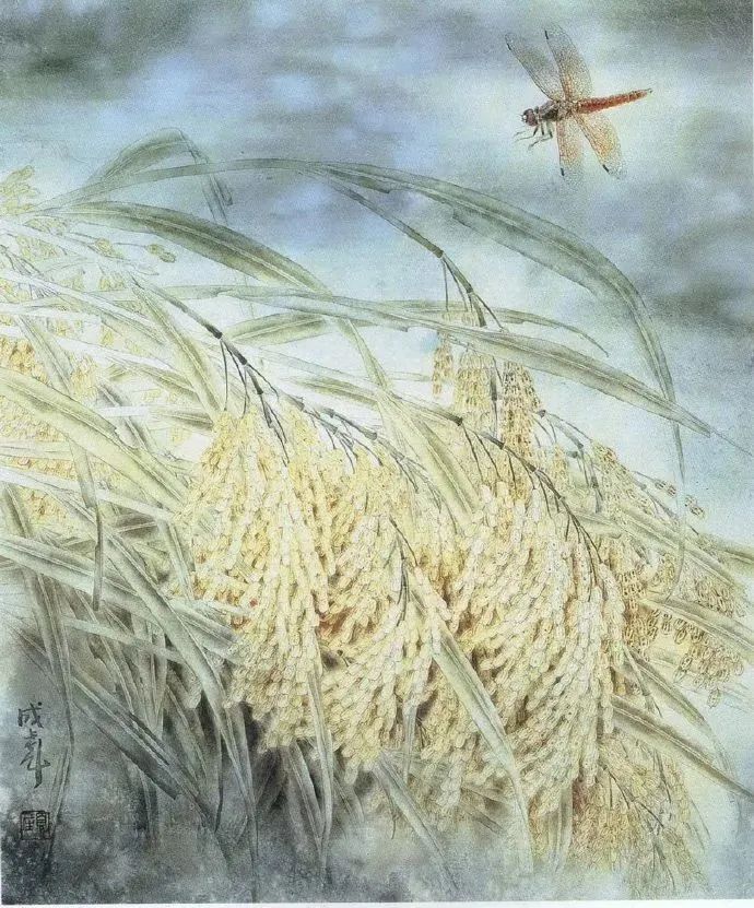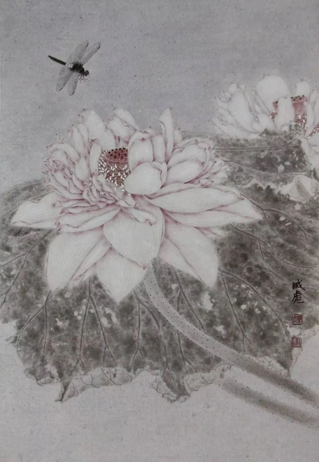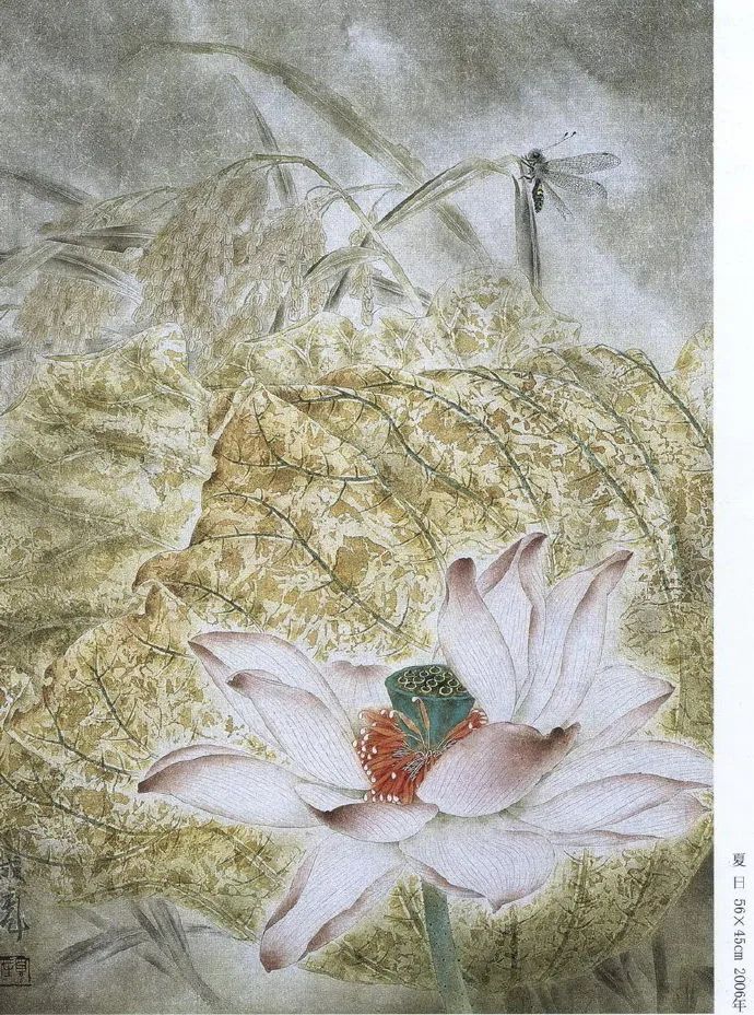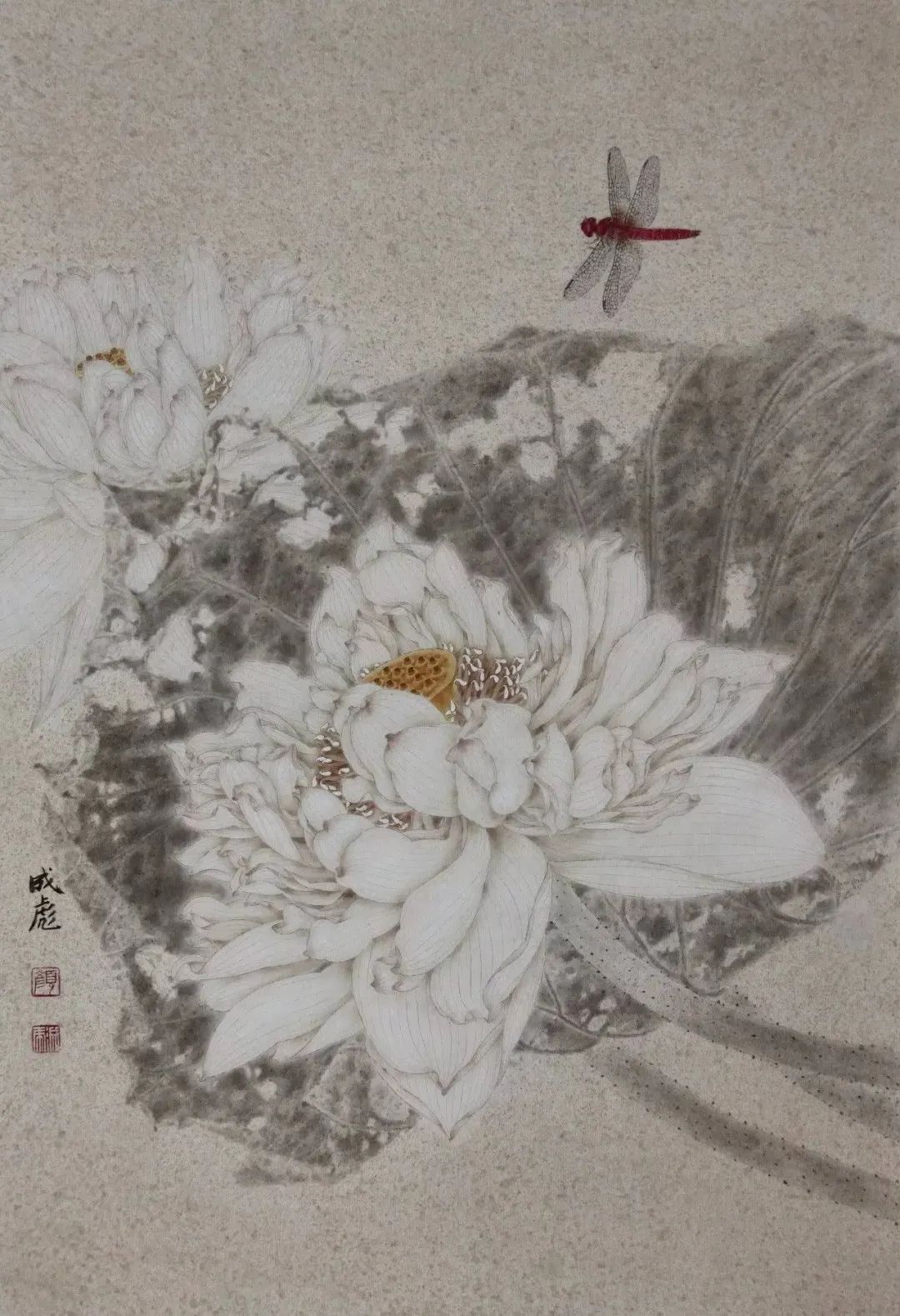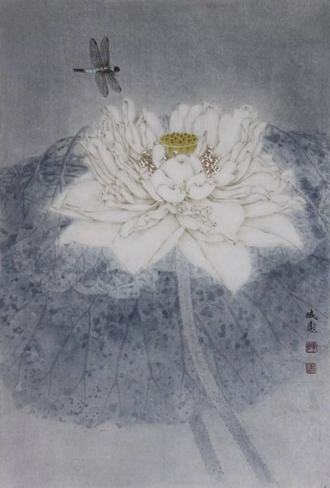在他的工笔画题材之中,有闲云野鹤,有一畦稻色,而最具有代表性的,无疑是他笔下的荷花。在中国“花文化”中,固然“水陆草木之花,可爱者甚蕃”,但荷花是最有情趣的咏花诗词对象与花鸟画题材,“出淤泥而不染,濯清莲而不妖”,端庄素雅、挺拔俊秀的花姿在颜成彪的笔下纤毫毕现、灵动精妙,或簇拥成团,或曳然绽放,引得鸟雀蜻蜓盘踞左右。
