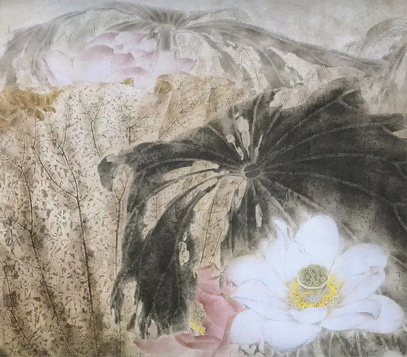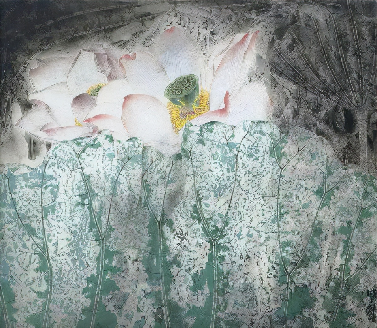 但他不仅只描绘莲叶田田,红消翠减的秋荷同样时常入画,从《秋语》《花开无尘》《花无语》《归去》这些作品题名的拟定之中,既取意高远,也包含了他自身对花开叶落、春去秋来的个人体会。