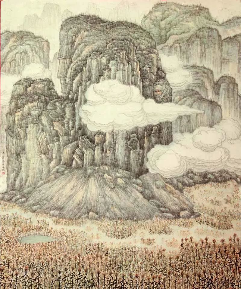 以这样的概念去欣赏蓝凡武的绘画,就会发现他的艺术真实存在于不经意间的有意安排:一口古老的水井,一块苍茫的玉米地,孤独遗留在山区里的残垣断壁,落满风霜的农宅茅舍等,都曾经是他的生活过的场景,现在被他转移到绘画的世界里,重新组合,却诠释出表象背后的真实来。