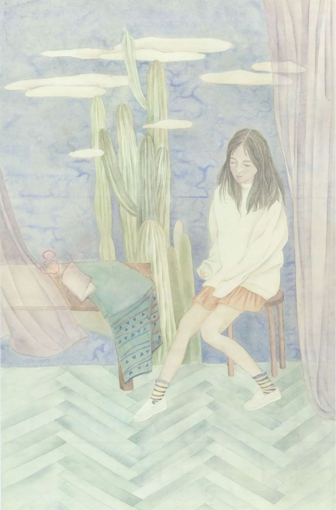 性格的多面性使我的画作呈现出并不那么有序的状态,因为始终不知自己该恒定于哪一面。大量的写生让我热爱现场绘画,措手不及却得到偶然惊喜,而冗长的创作构思过程令人沉湎于内心独白。安静或热闹,观者看来是二次元假象的呈现,殊不知是画者精神世界的一场华丽演出。