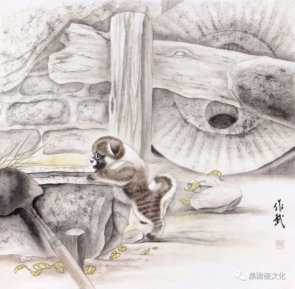 而马作武的作品中,没有呆板的矫饰和程序化的情境铺垫,往往直入主题,在娴熟生动的线性和韵律丰富的墨色的勾染映照下,画面主体形象灵动鲜活,跃然纸上,这在他的单体动物作品中尤为多见。
