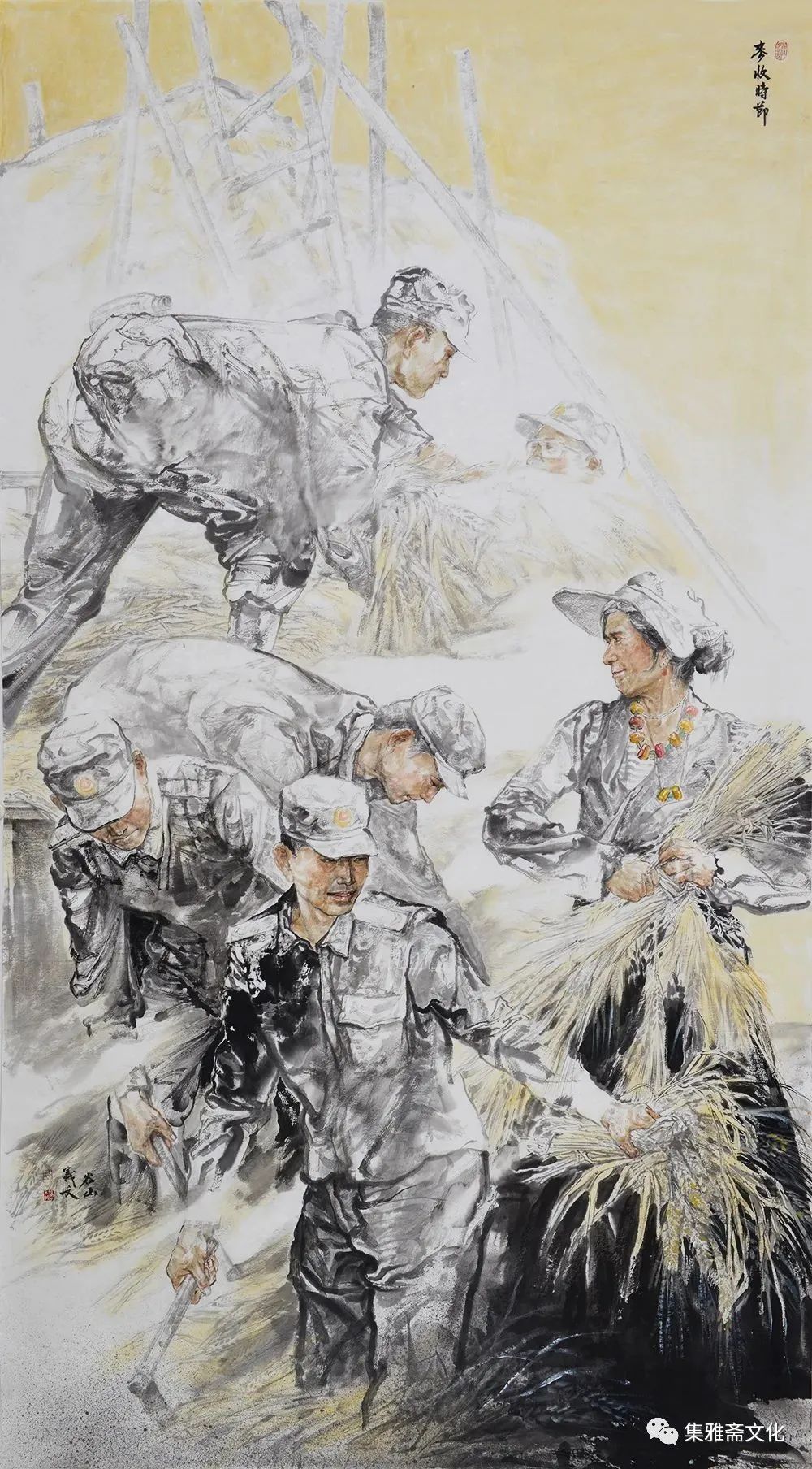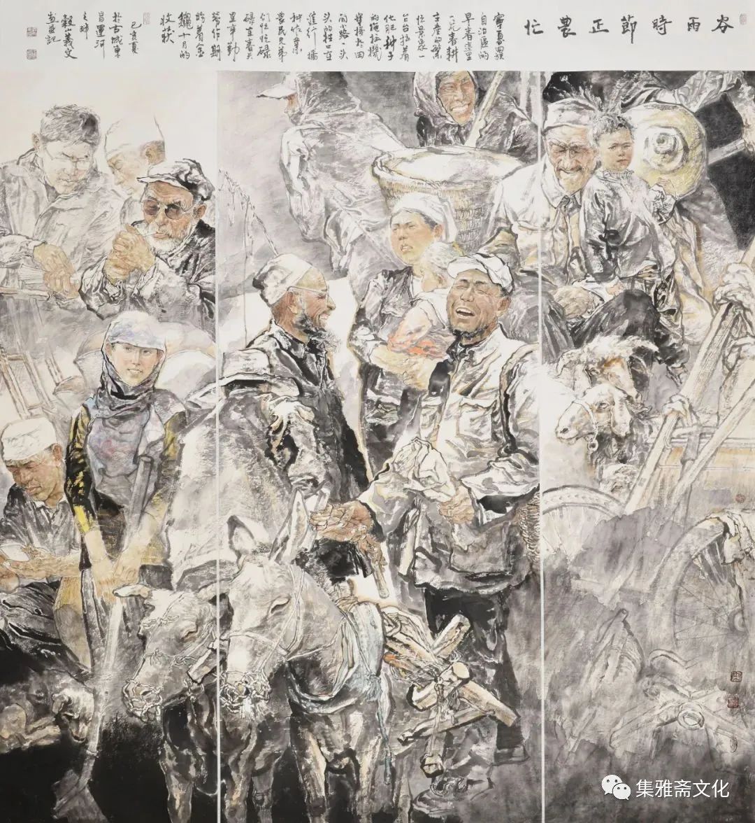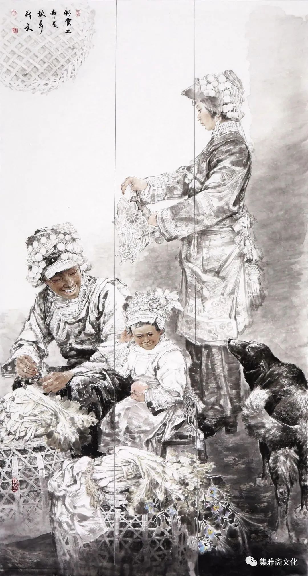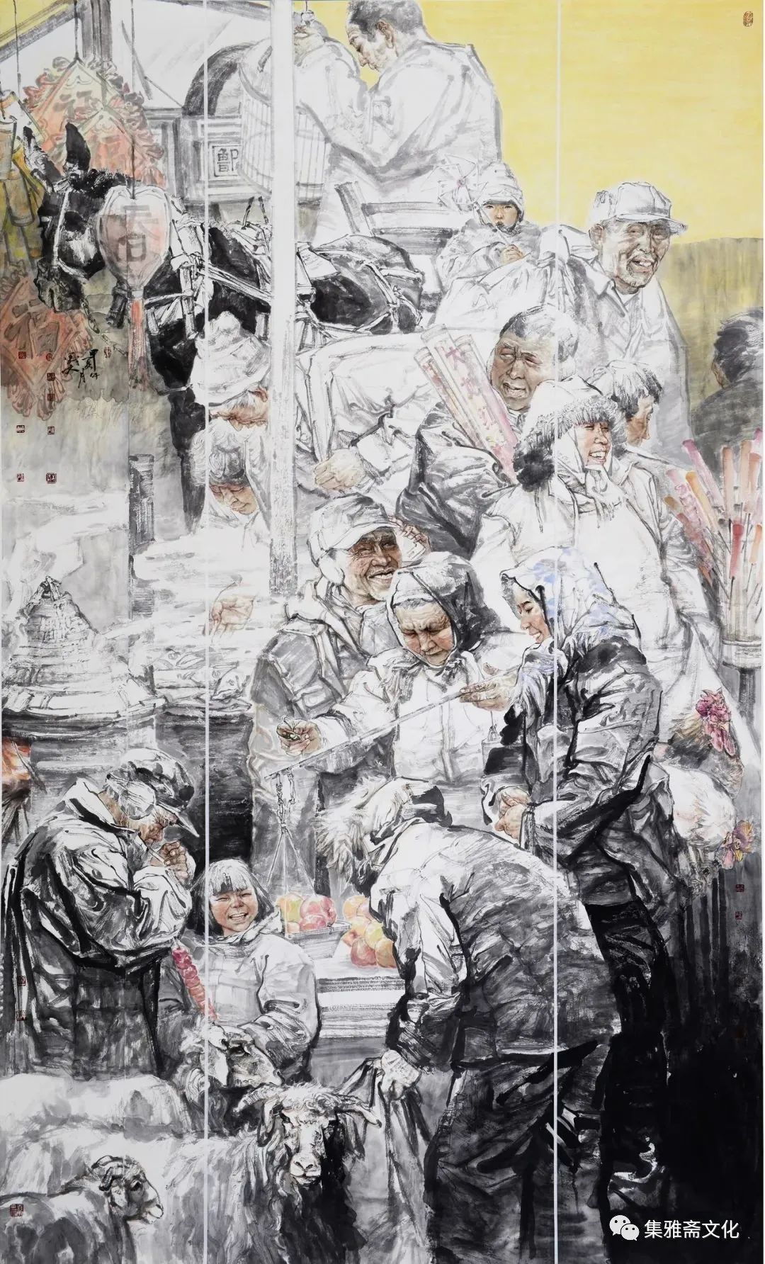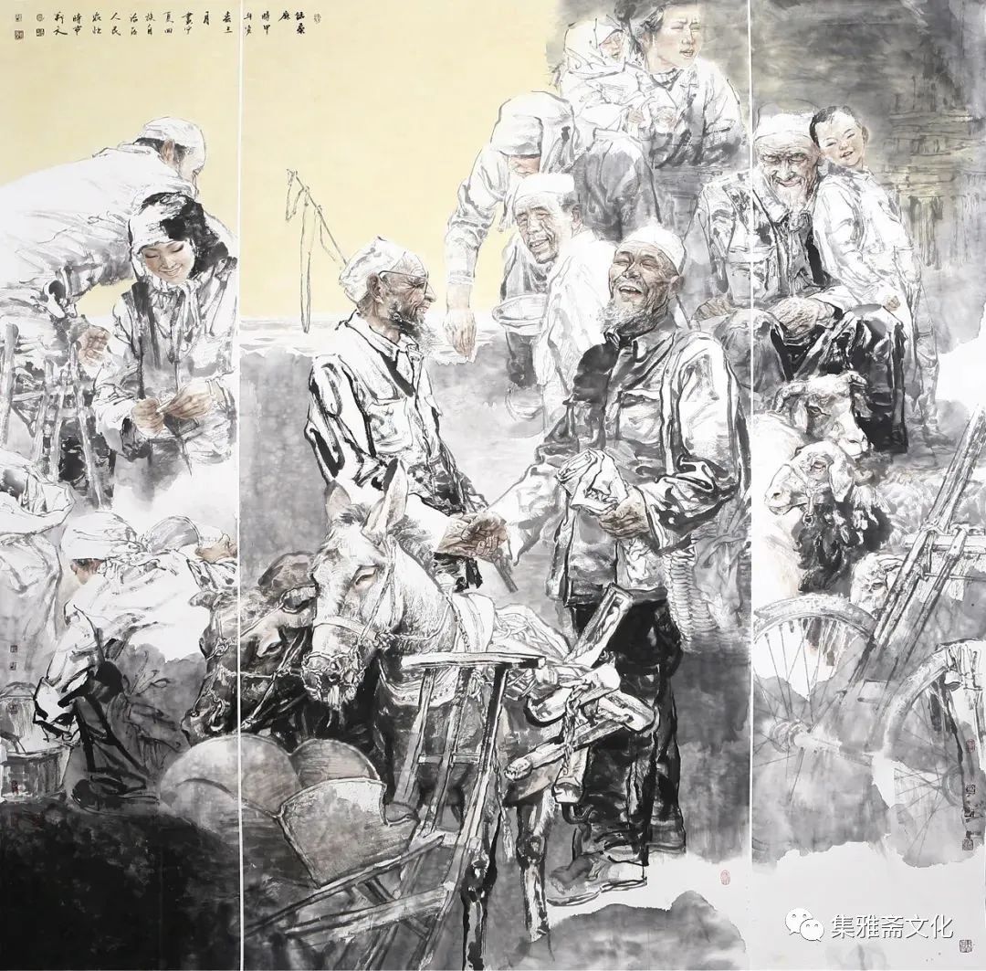 分析作品,不难发现,宋义文把现实生活中的人物用艺术手法提升为感性生动的生命形式,并赋予极有特点的笔墨形式与结构;首先,他从早期的“写实”观念中解放了出来,力求在平面空间中处理人与人、人与物、以及物与物的关系,使形式、内容、笔墨都获得表现的自由,进而使自己的作品更符合艺术规律;其次,他坚持以“线”为主的写意方式,这不仅是对写意传统的继承,更是对写意传统重新阐释和解读,