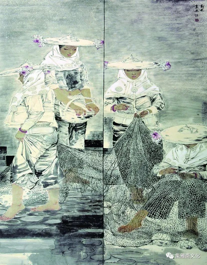 以线为艺术特征的中国人物画,在经过漫长时间的历练中,几近完美无瑕,炉火纯青,从东晋顾恺之的以“连绵不绝”、“春蚕吐丝”为特征的线条,到陆探微的“笔迹劲利、如锥刀焉”等等,都体现早期中国人物画用线密集的特点,至南北朝的张僧繇,则一扫“密体”画风,而为“疏体”,用笔精练简约,即以“点曳斫拂”为特点;