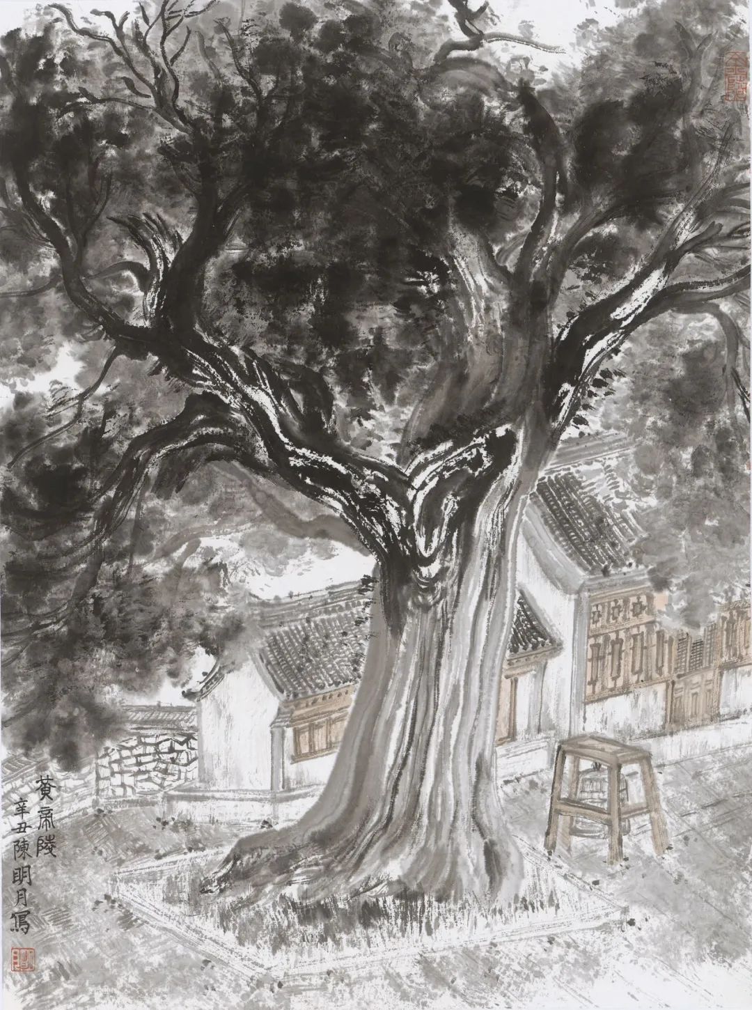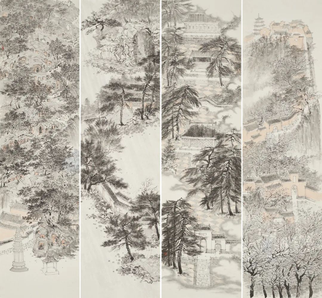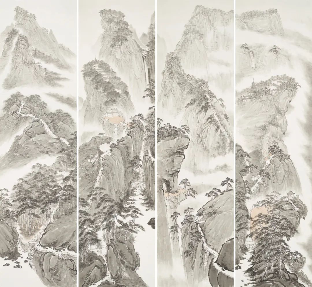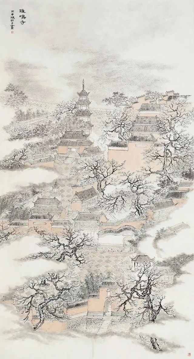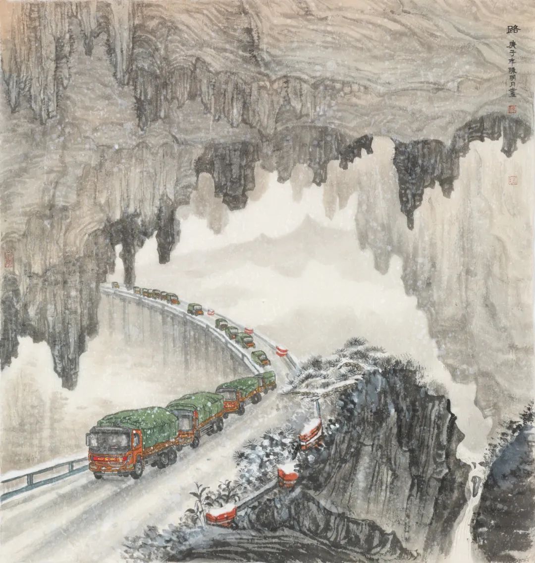 陈明月也是严谨细心的年轻画家,在浮夸快餐遍布的当下,她可以安静且孜孜不倦的细笔勾描、小笔皴擦,无论是对于山石肌理的细节处理还是对树木枝叶的勾勒点染,抑或是对于现代元素的表达,均可以运用其较为扎实的传统技法进行描绘,使得作品耐看、隽永且富有灵韵。