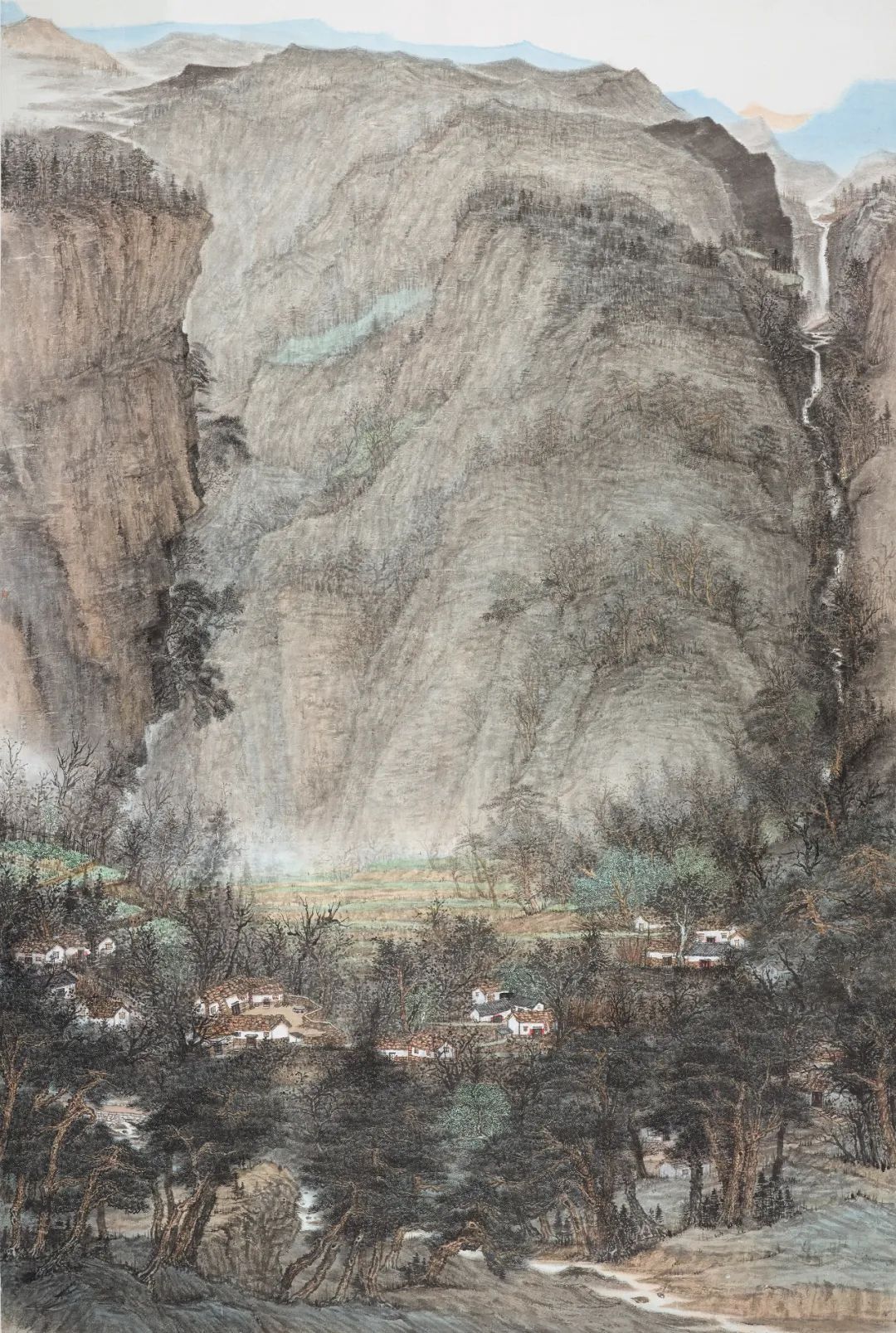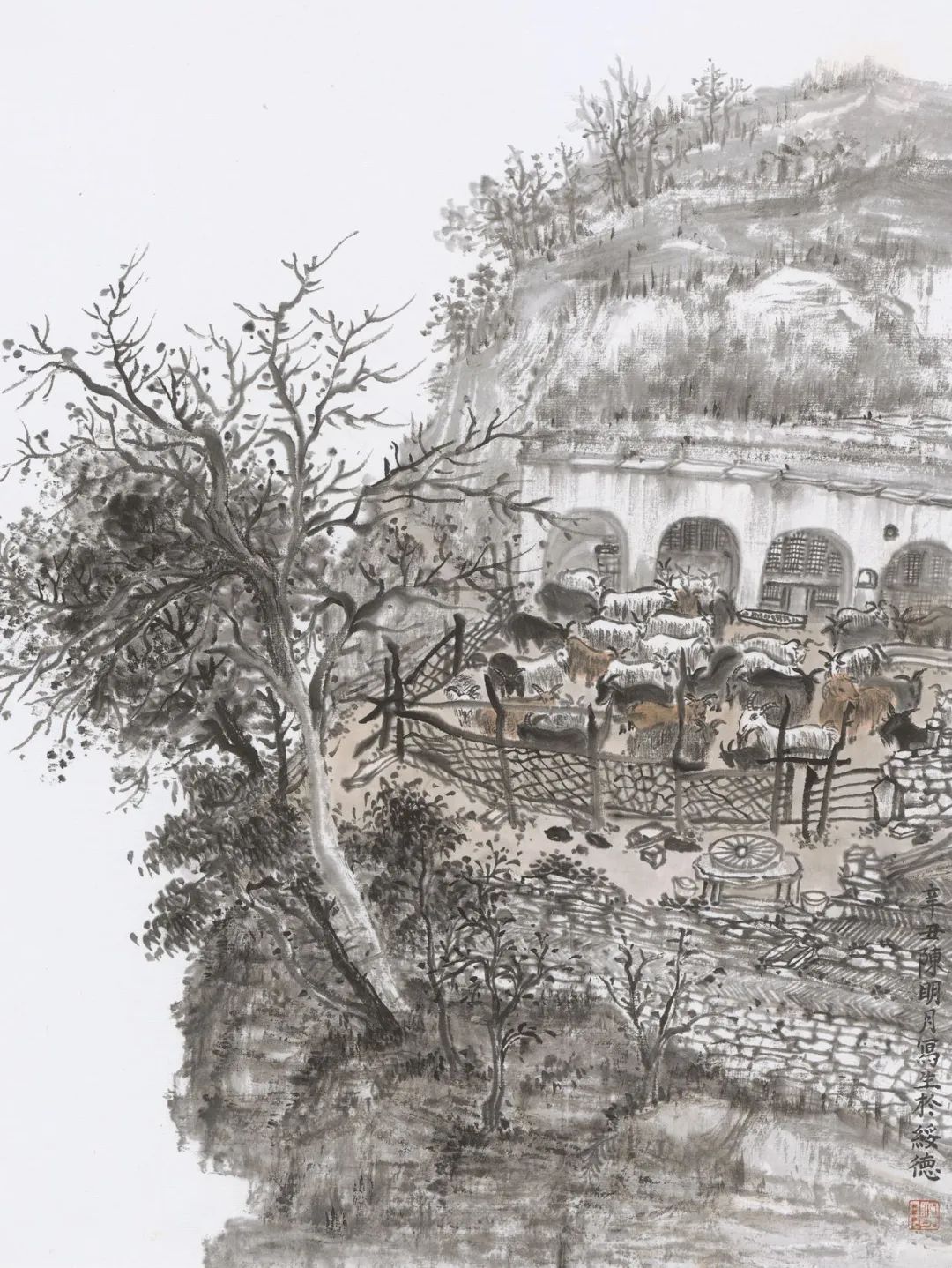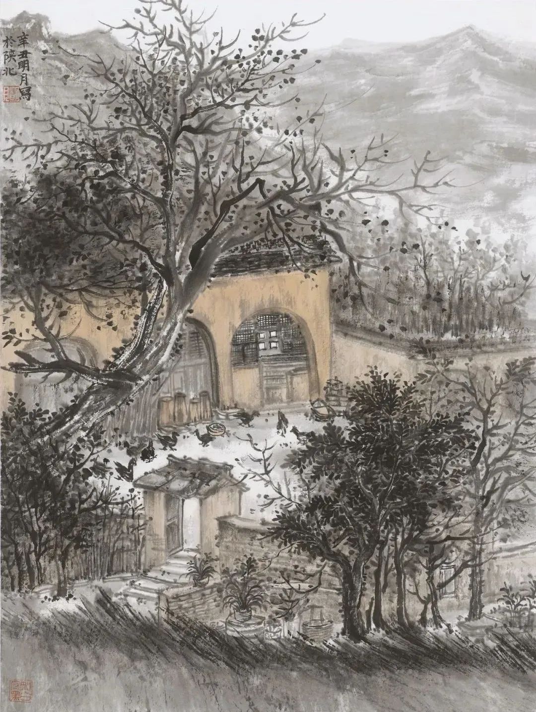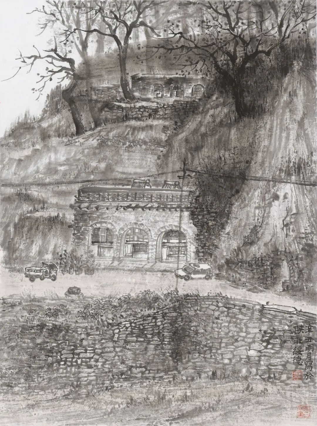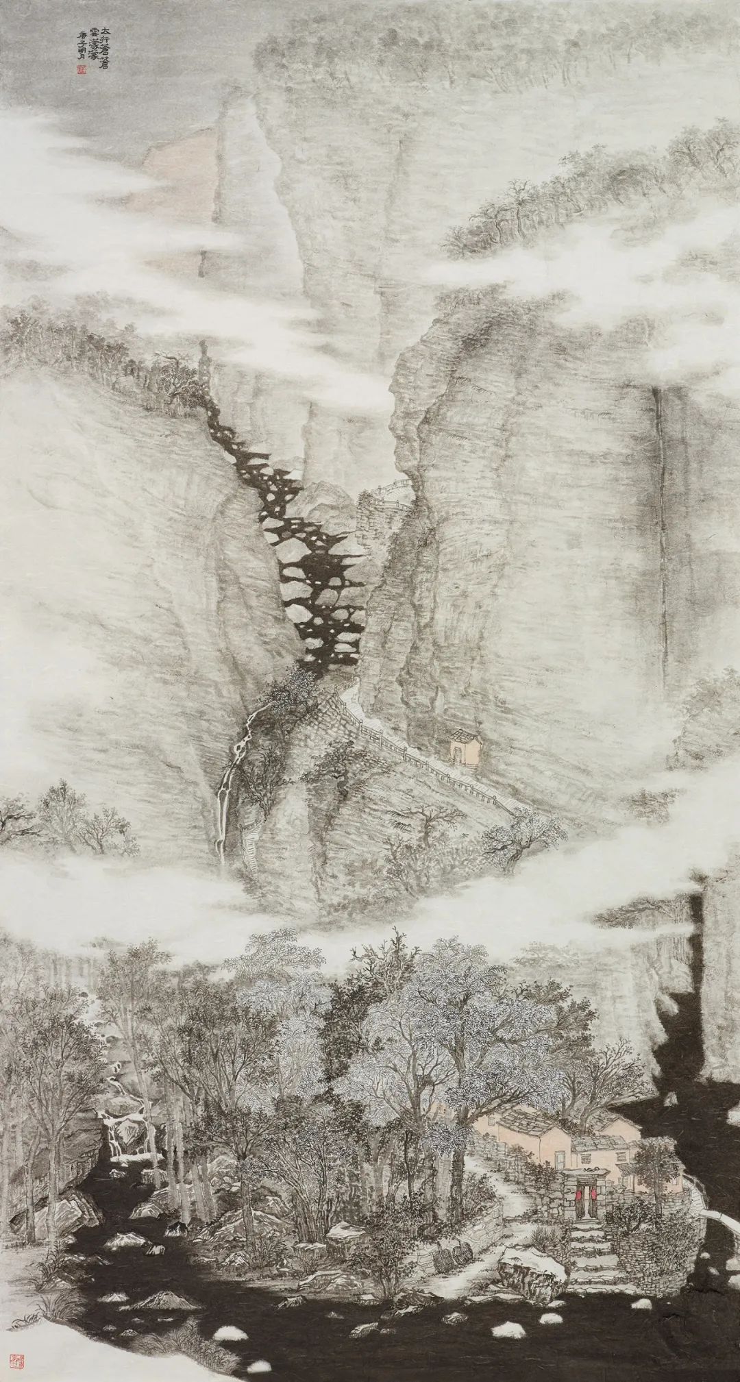 陈明月也是严谨细心的年轻画家,在浮夸快餐遍布的当下,她可以安静且孜孜不倦的细笔勾描、小笔皴擦,无论是对于山石肌理的细节处理还是对树木枝叶的勾勒点染,抑或是对于现代元素的表达,均可以运用其较为扎实的传统技法进行描绘,使得作品耐看、隽永且富有灵韵。