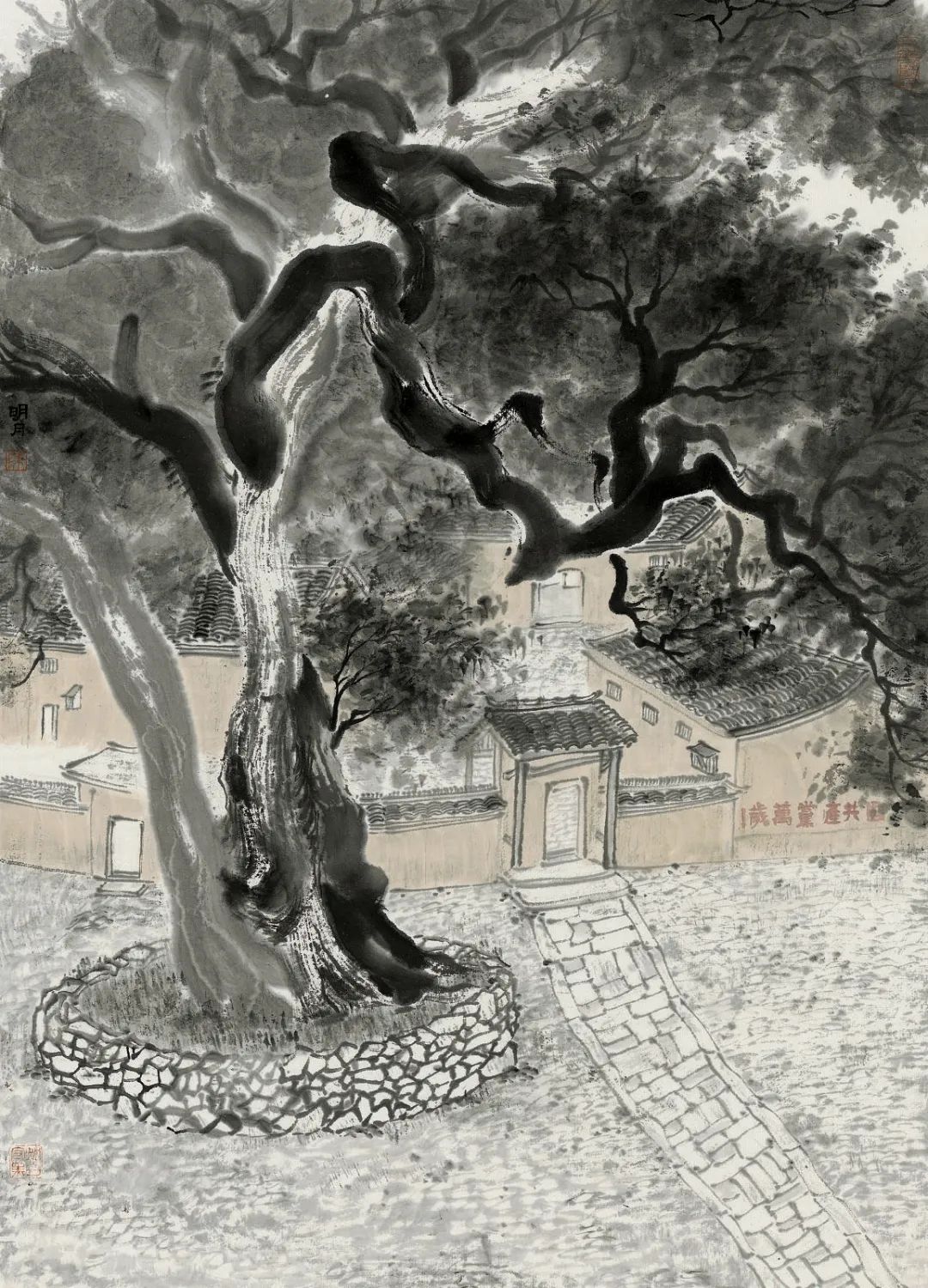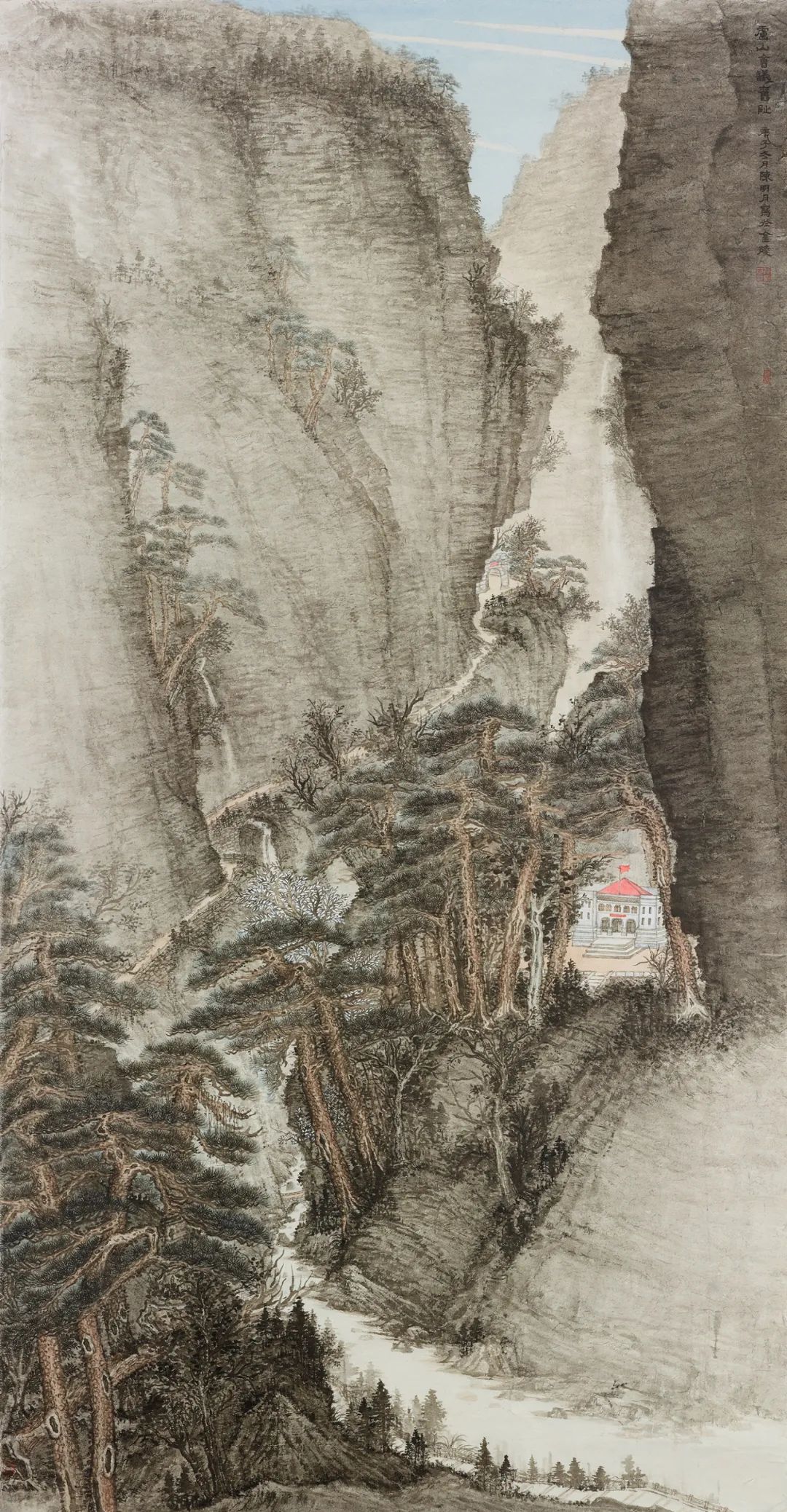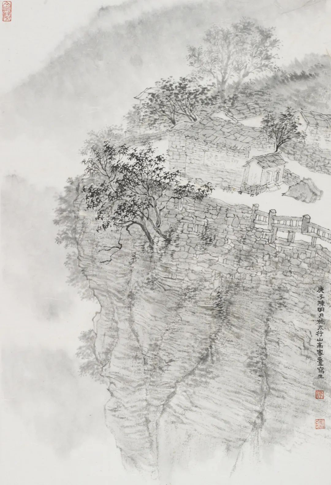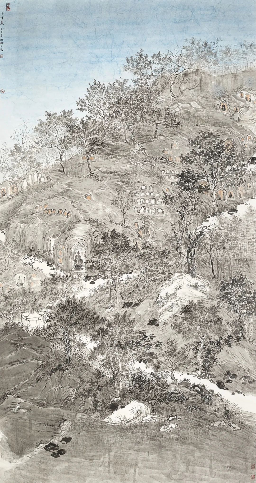 陈明月也是严谨细心的年轻画家,在浮夸快餐遍布的当下,她可以安静且孜孜不倦的细笔勾描、小笔皴擦,无论是对于山石肌理的细节处理还是对树木枝叶的勾勒点染,抑或是对于现代元素的表达,均可以运用其较为扎实的传统技法进行描绘,使得作品耐看、隽永且富有灵韵。