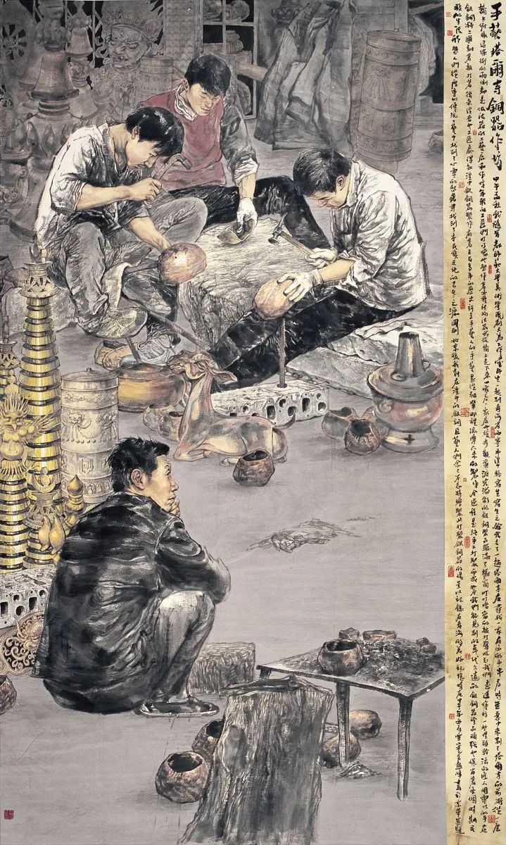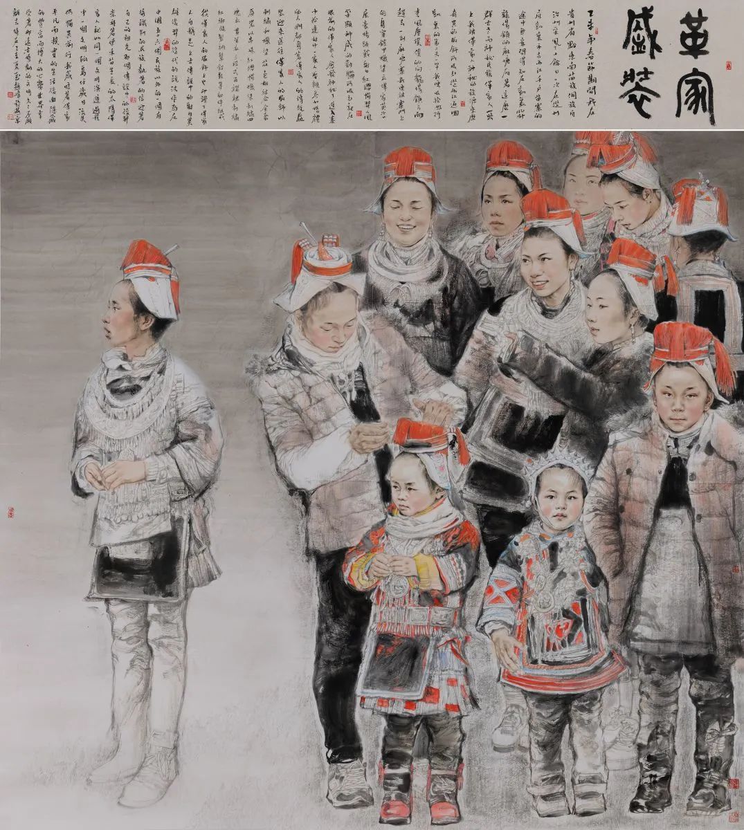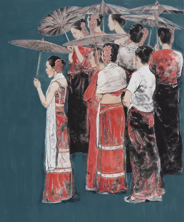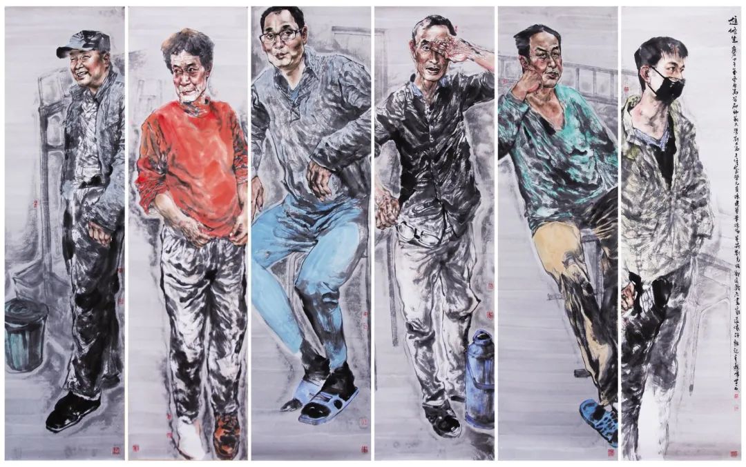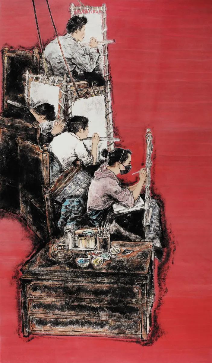 记得他在一年级下学期,就已经开始在画室的墙上裱上厚厚的宣纸,画起了四米多长的创作,成熟的人物造型和画面组合已经让我无法想象,那是一个刚入校门一年不到的学生所为,有一种“后生可畏”的气势。