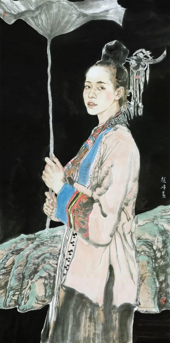 赵峰的作品坚持的是以造型带动笔墨转变的理念,并力求在严格的造型与精美的笔墨,这似乎矛盾的两者之间找到一种统一和协调。因此,他在创作中即很好的保持了传统中国人物画的笔墨情趣,又有极强的现代感与抒情性。