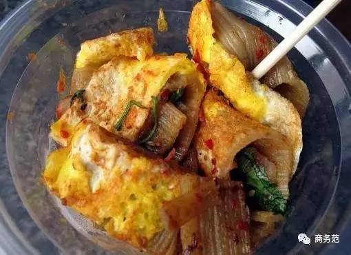 烤冷面这种食物,在大学城附近最流行。每当夜幕降临,固定摊位或者烤冷面车就会烧热铁板,刷好油把压制过的面饼放在上面煎。加上鸡蛋香肠,刷上甜辣酱,切成小段,就可以吃了~它是莘莘学子们下晚自习后的慰藉。