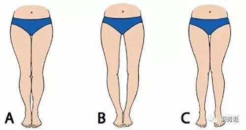 以下图为例:B号腿的双腿内弓,是传说中的O型腿,腿缝过大,影响美观;C号腿的小腿外翻,是十足的X腿,不仅影响美观更显腿短;只有无缝对接的A号腿才称得上是完美腿型↓