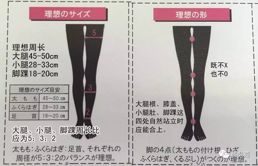 正面看上去,大、小腿,脚踝的比例为5:3:2,大腿长度在45-50cm之间,小腿长度在28-33cm之间,脚踝长度在18-20cm之间;而大腿根、膝盖、小腿肚、脚踝这四点在自然站立时应该相互触碰,既不X也不O才算完美↓