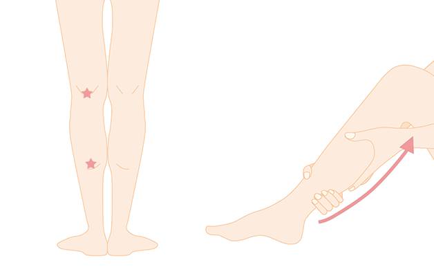 2.坐下时,以小腿肚、膝盖窝这两点为基准,从下向上揉搓。可以舒缓双腿肌肉↓