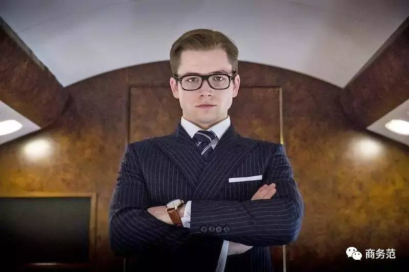 《王牌特工》里的艾格西(Taron Egerton饰)就是非常心机的用条纹领带配暗纹西装。