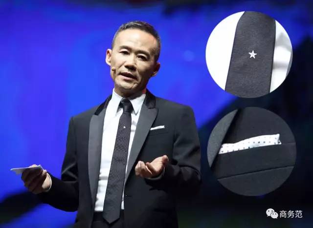 一般来说,窄领带会显得整个人更加精致干练,之前王石王美人在出席活动时,就用一身Givenchy西装搭配窄领带和白色点点图案的领口巾,胸口处领带上的白色小星星就是个不错的亮点~