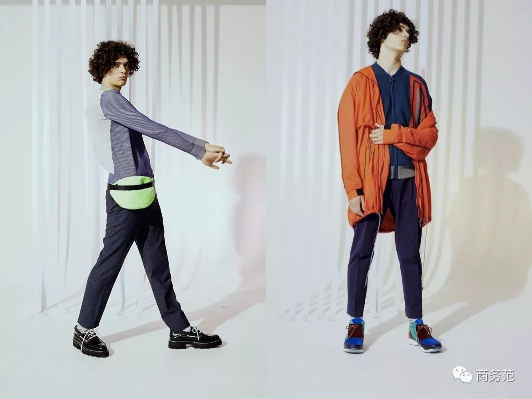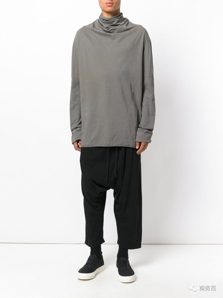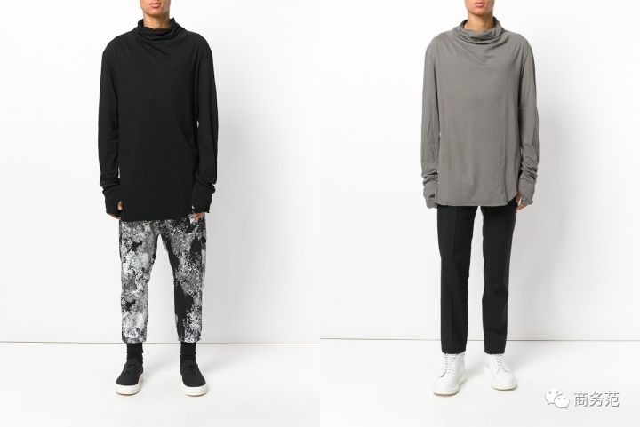 先看男装,基本是走长款加折皱高领风,适合比较瘦高的男性范友。可以搭配一条垮裤,可穿出一种原宿风的赶脚。